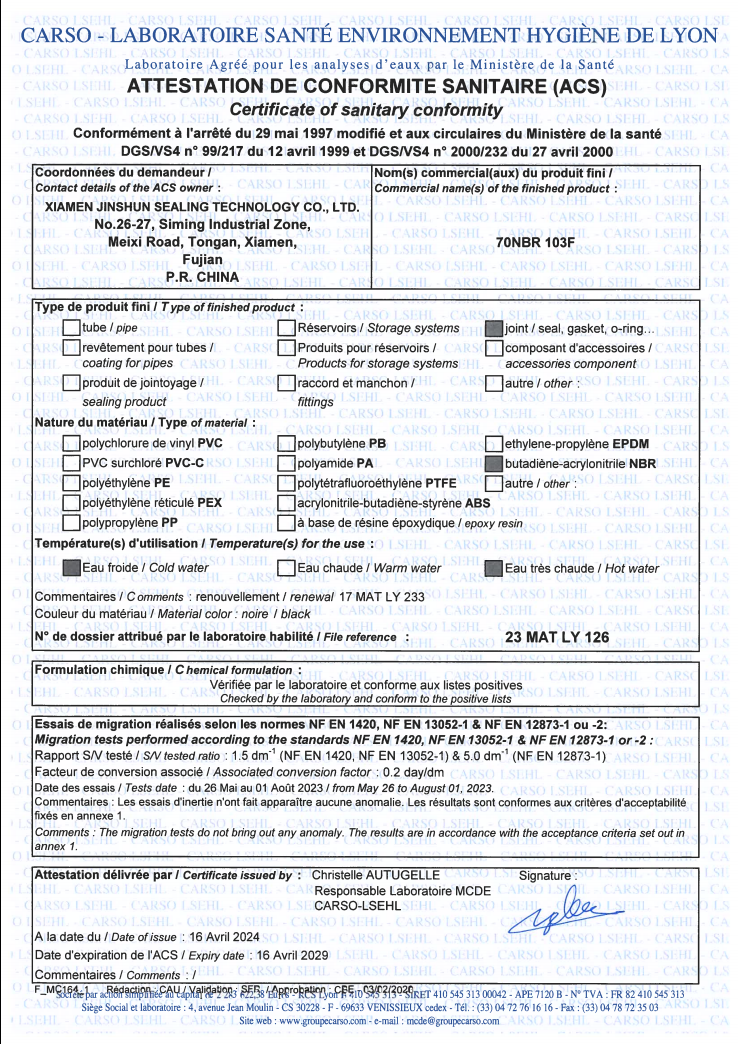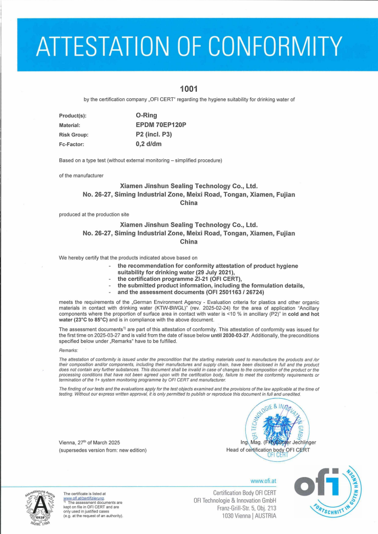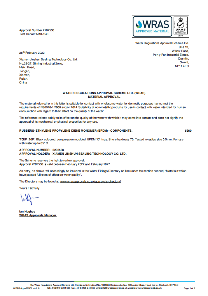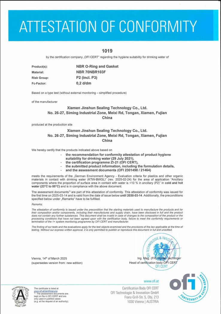 KTW-BWGL NBR KTW-BWGL SILICONE WRAS-EPDM NSF-61